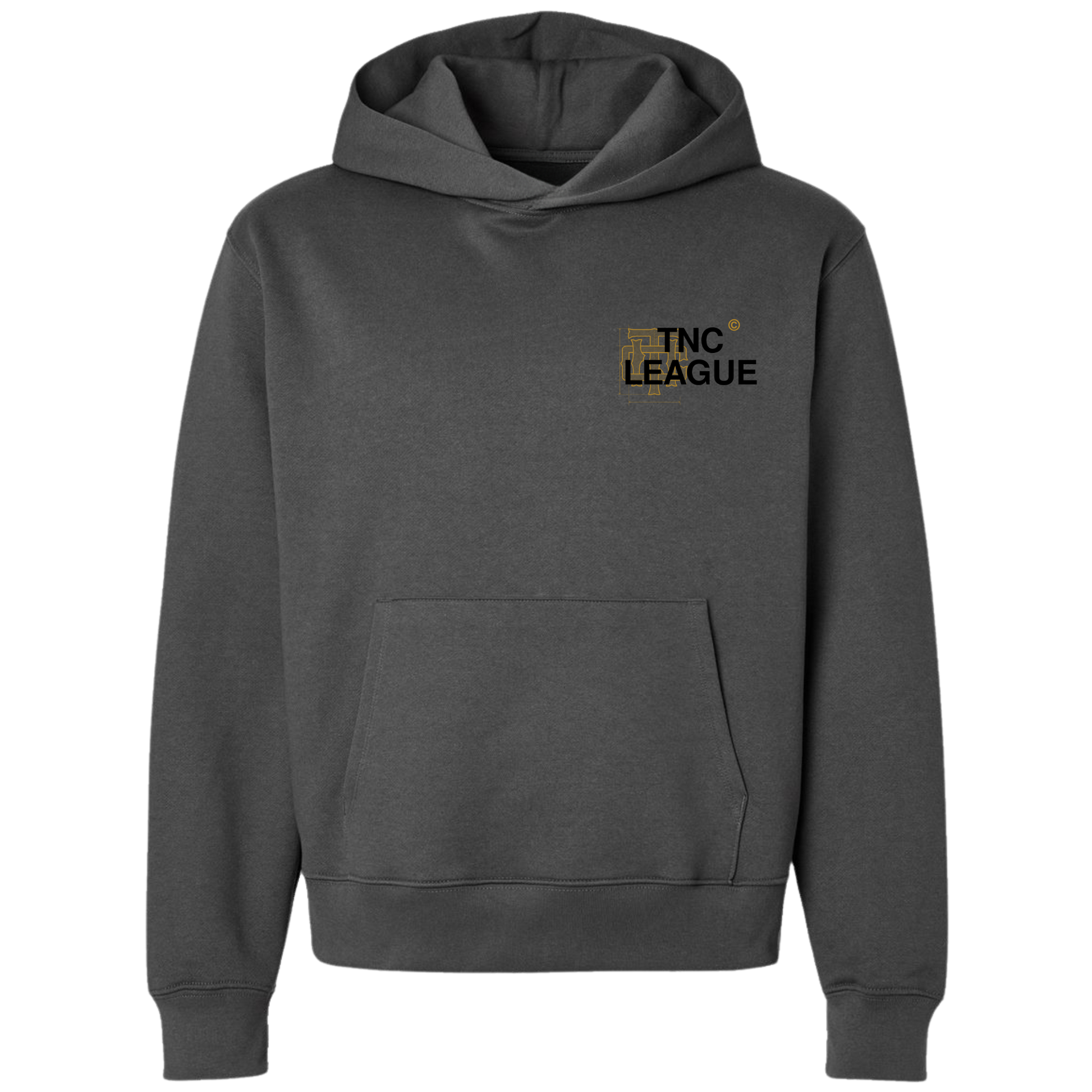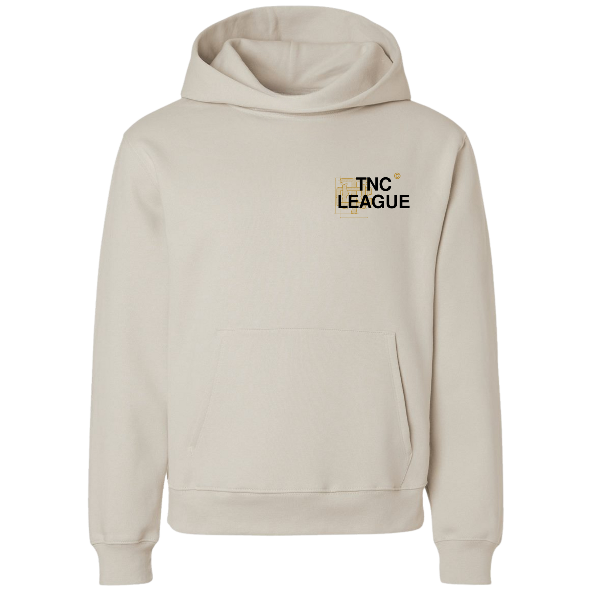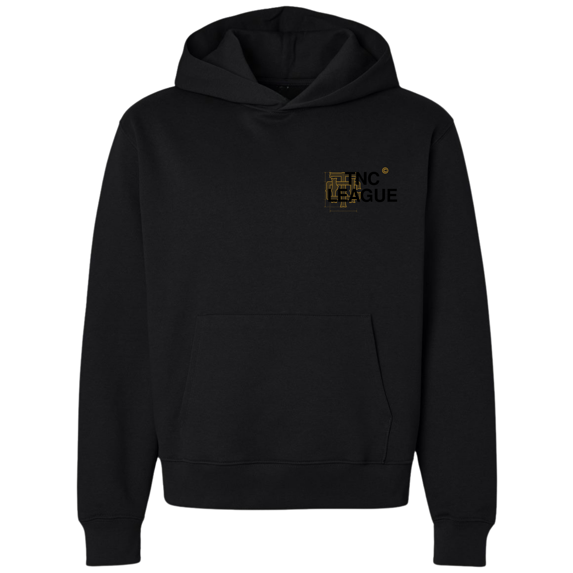 The front features the TNC League chest mark, layered over blueprint-style detailing, a reminder that nothing we’re doing is accidental. It’s planned. Designed. Earned.