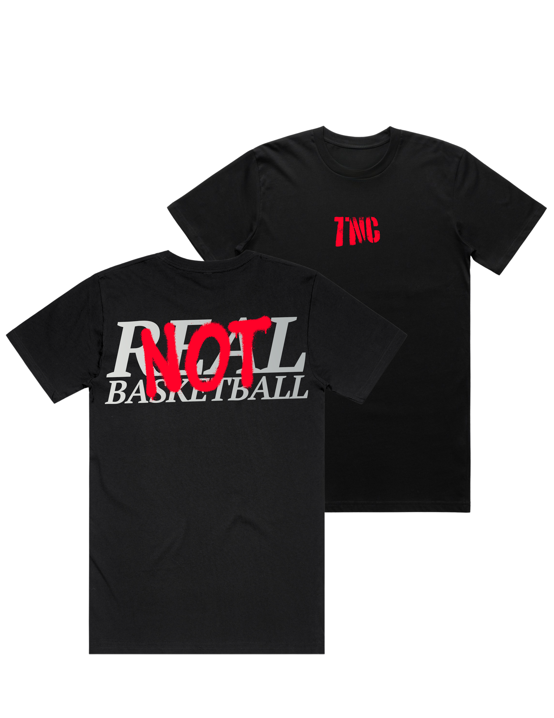 Crafted from premium cotton, this shirt delivers comfort while making a statement. The front features the iconic TNC logo in striking red, while the back demands attention with the bold “REAL BASKETBALL” print, slashed through by a rebellious red “NOT.”