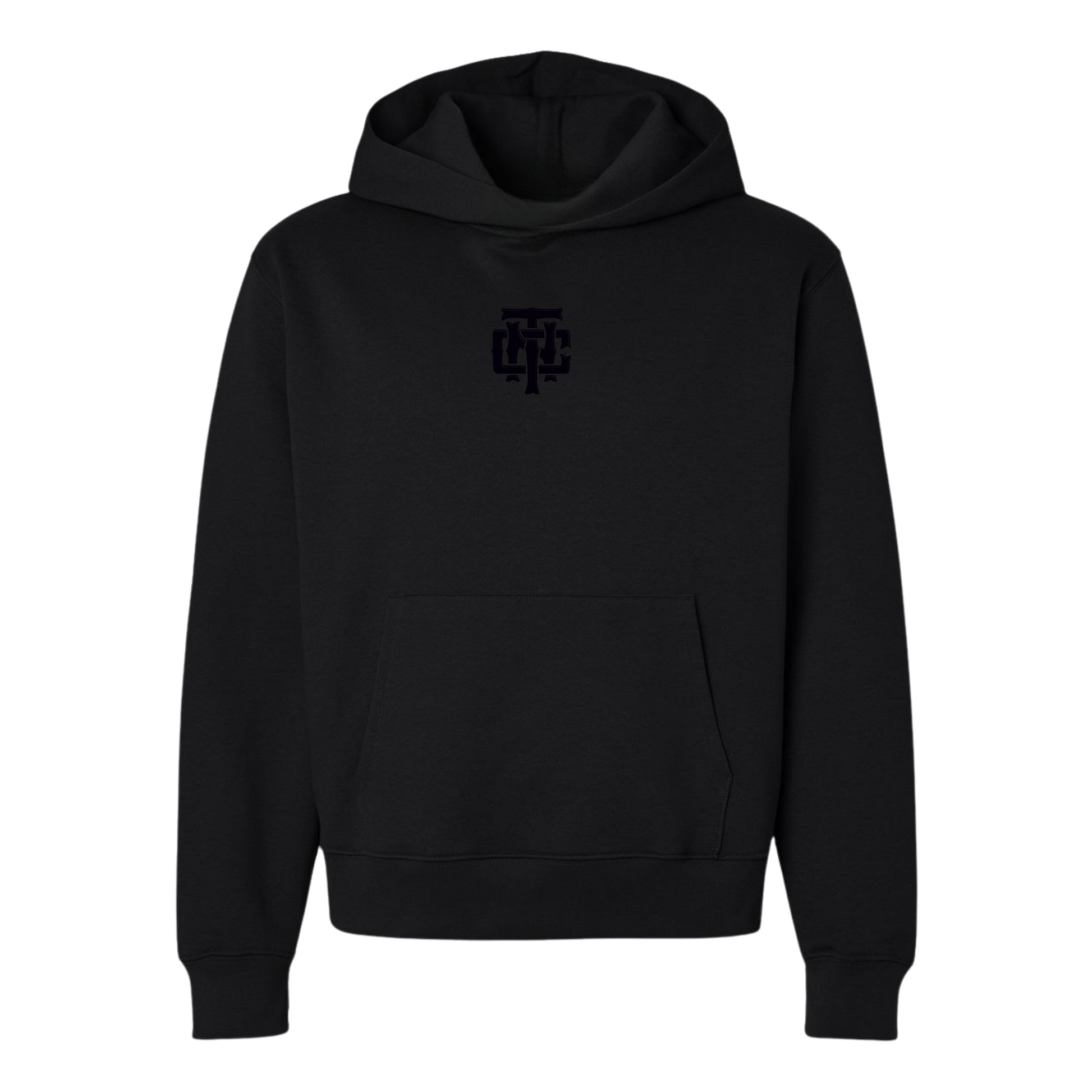 This piece is built for subtle confidence. No loud graphics. No flex needed. Just a clean, all-black heavyweight hoodie featuring a tonal black-on-black embroidered TNC monogram stitched on the center chest.